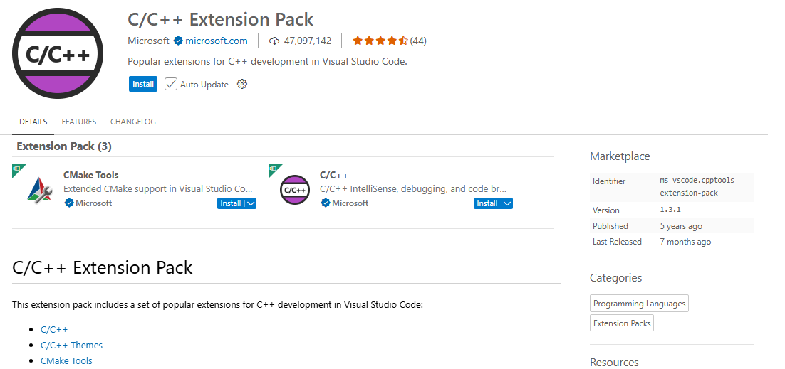 When you open a project with C files in VS Code, it offers to install C/C++ extension Pack by Microsoft which you should do. If you miss the chance, find it in the extension sidebar and install it. Note that this doesn't include a C/C++ compiler or CMake, but it does include compiler support and CMake Tools which helps CMake work with VS Code.