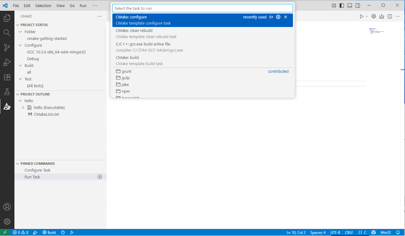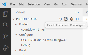 Delete the contents of the \build folder in your project then rerun CMake: configure. CMake Tools sidebar - Pinned Commands - Run Task - CMake: configure
