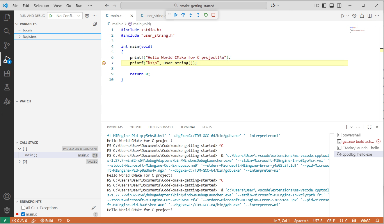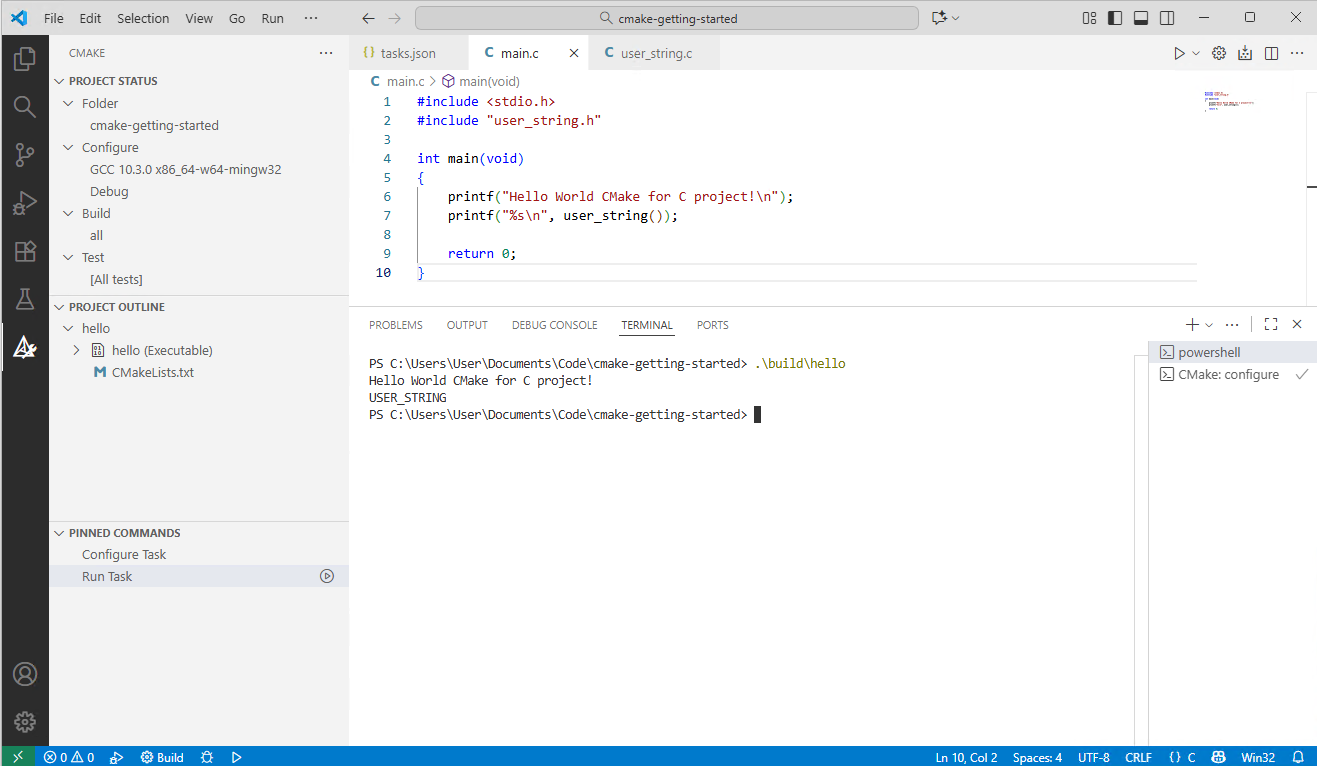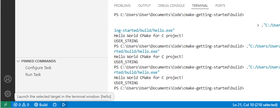 to run the exe in the powershell terminal inside VS Code, use the syntax .\build\hello