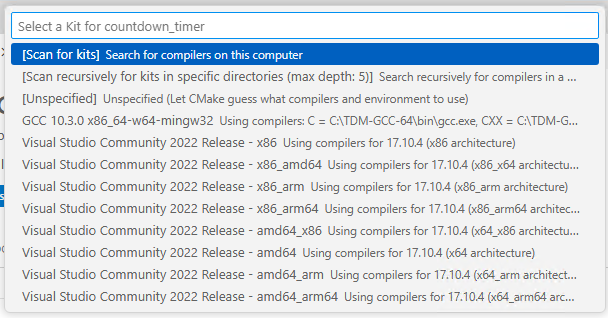 When scan for kits comes up, choose GCC 10.3.0 x86_64-w64-mingw32