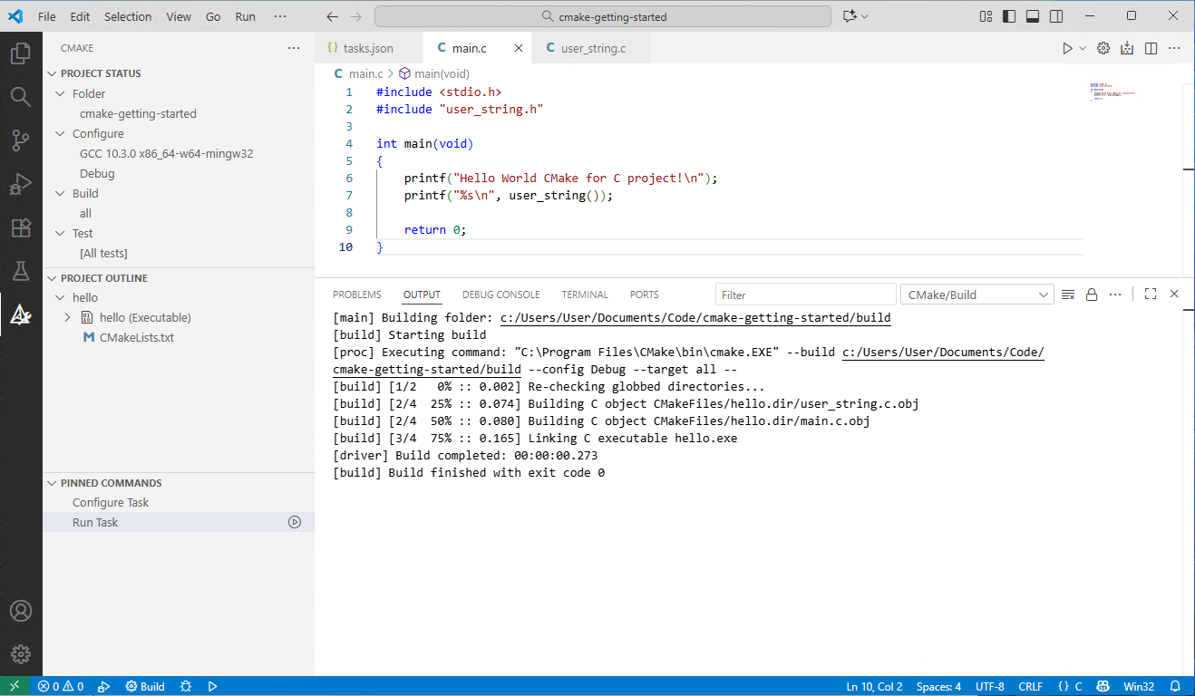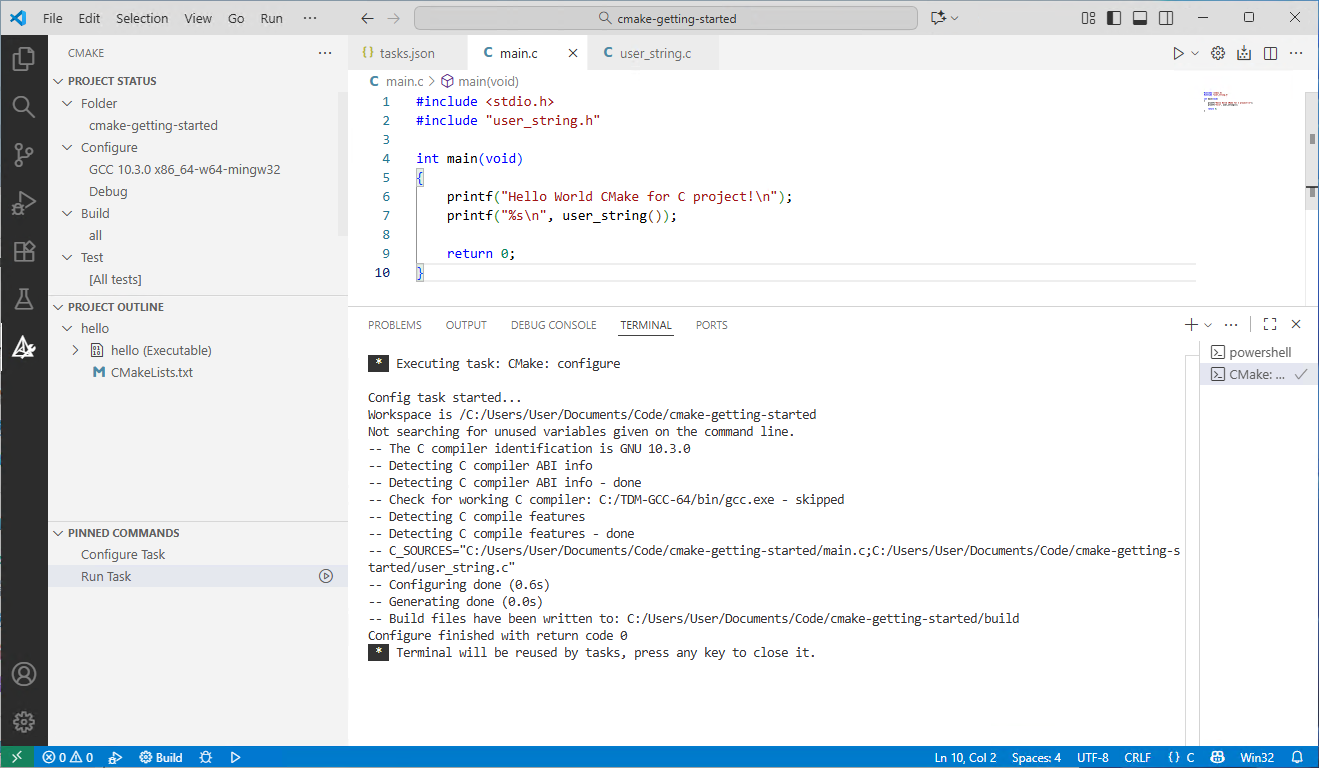 Clone or download my cmake-getting-started-c project from GitHub and open it with VS Code. Since this is a getting started project, I've used the shortcut method of global recurse to include all the .c files in the folder to prevent you from getting stuck if you renamed or added c files to the project, but this isn't considered best practice.