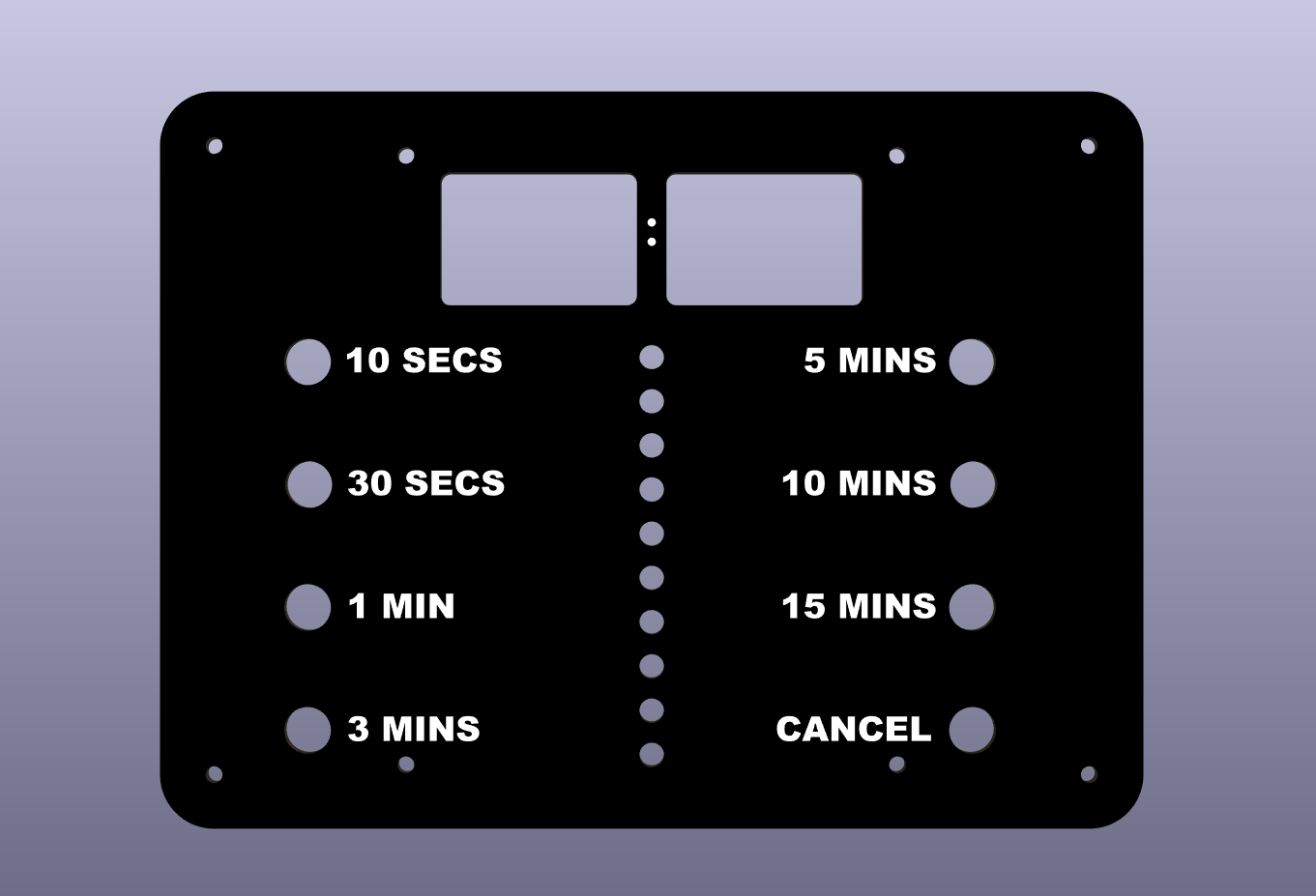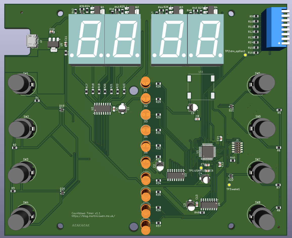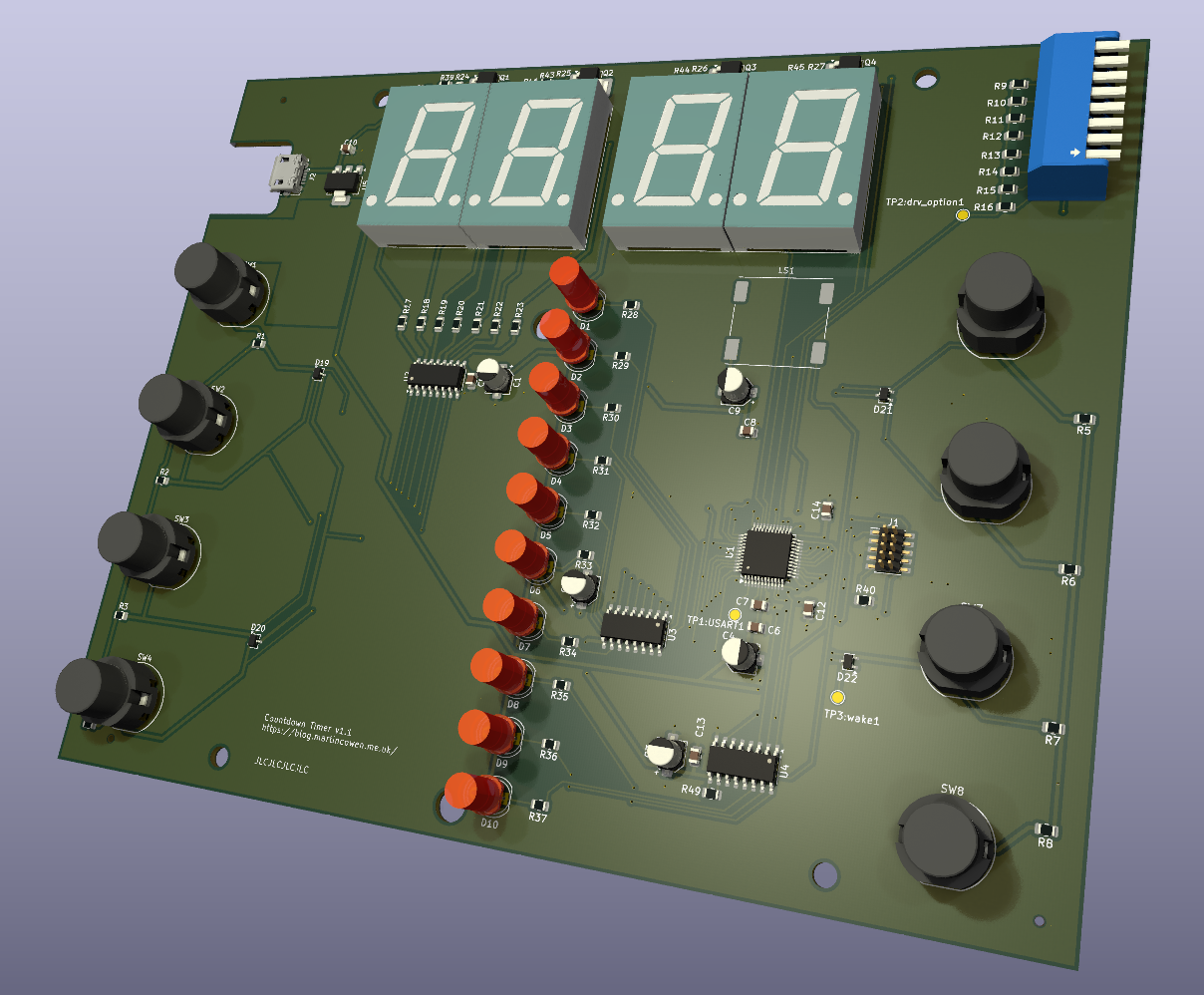 The idea for this project was a simple countdown timer to be used for various children's games and activities where the user interface was designed to be as simple as possible; the display was clear from across the room and provided a sense of urgency, with a clear notification when the time was up. I started from the need for a large bright display, which meant using the largest economically available 7-segment LED modules. Starting a timer should be as simple as pressing a single button with a fixed function, so there is no time adjustment (up/down) facility which can be fiddly and non-obvious to use. Those often require long presses to get into a fast increment mode and are not consistent in how they accelerate. Choosing the time periods at the start of the project meant that the front panel could be labelled. Seven periods covered the desired range of 10 seconds to 15 minutes and left one button to be used for cancel, making a nicely symmetrical 4 buttons arrangement down either side. A coloured bargraph display was designed to give a sense of what proportion of the original time has elapsed and how much remains, using 10% steps. A speaker was included to play a tune when the countdown was completed.