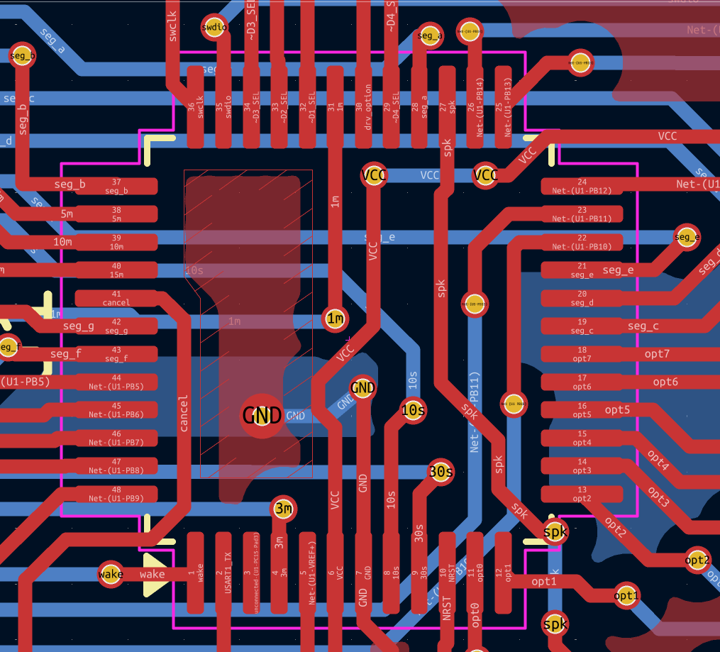 For this layout, I decided to choose the pin functions when drawing up the schematic and stick with them during layout to simulate having an external constraint. I wanted to experience whatever difficulties this might cause and learn how to overcome those routing problems, rather than take advantage of not having external constraints. If the routing was made too easy by using pin swapping, I would not have to learn how to route out of tight spots caused by other tracks.