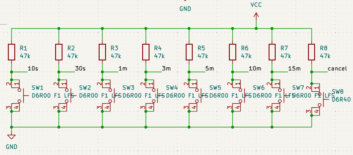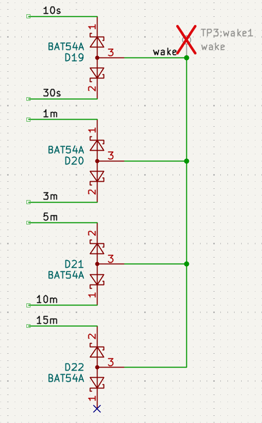 To allow for any time selection button (not including Cancel) to wake the processor from sleep, the lines are dioded together with BAT54A's and an internal pullup. If any button is pressed, the wake line will go low. These didn't need to be Schottky diodes, just cheap, in-stock, common anode diodes in a SOT-23/SOT-323 package.