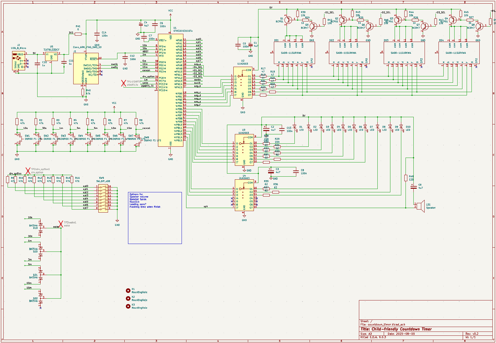 A pull-up was necessary because the UNL2003 is open collector, and a d.c. blocking capacitor is present to avoid burning out the speaker in case of the driver being left in the on state for more than a few milliseconds. During board bring-up, IO pins may not yet be setup correctly and even after they have been, halting the program at a random location could leave a pin driven for longer than they would whilst running. The speaker is driven from PB15 which has a PWM peripheral option using channel 3N, enabling uninterrupted tones without interrupting the micro at the tone frequency.