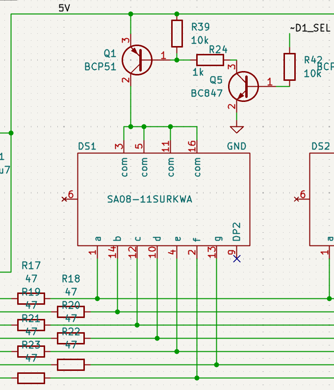 A few parts I needed were not found in the KiCad library. I had to draw footprints for the C&K D6 button, the Kingbright SA08-11 7-segment display, and the