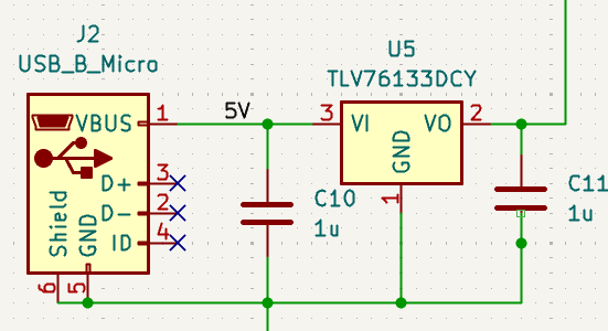 The original plan was to use a battery holder with 2 or 3 AA batteries, soldered to the back of the board low down to provide mechanical stability when upright. However, the power consumption of the LEDs meant that battery life was going to be very short and it was going to be more efficient to run from 5V over USB from a battery bank that I had available. The higher power components pull from the 5V line so that they don't pull current through the 3.3V regulator and heat it up. I placed a zero ohm link after the regulator which, by removing it before the board was powered up, allowed me to test the regulator on it's own without risking the processor.
